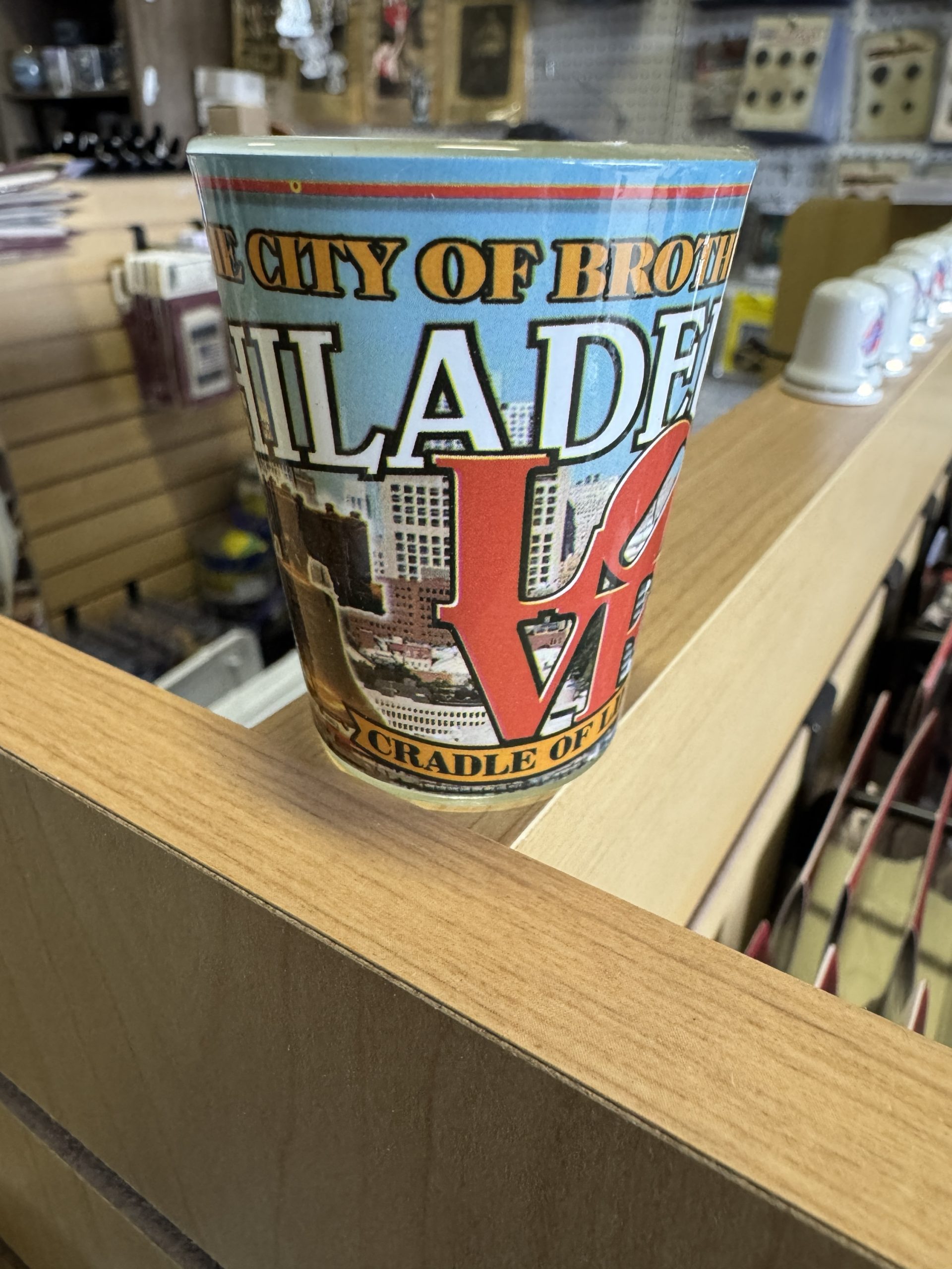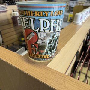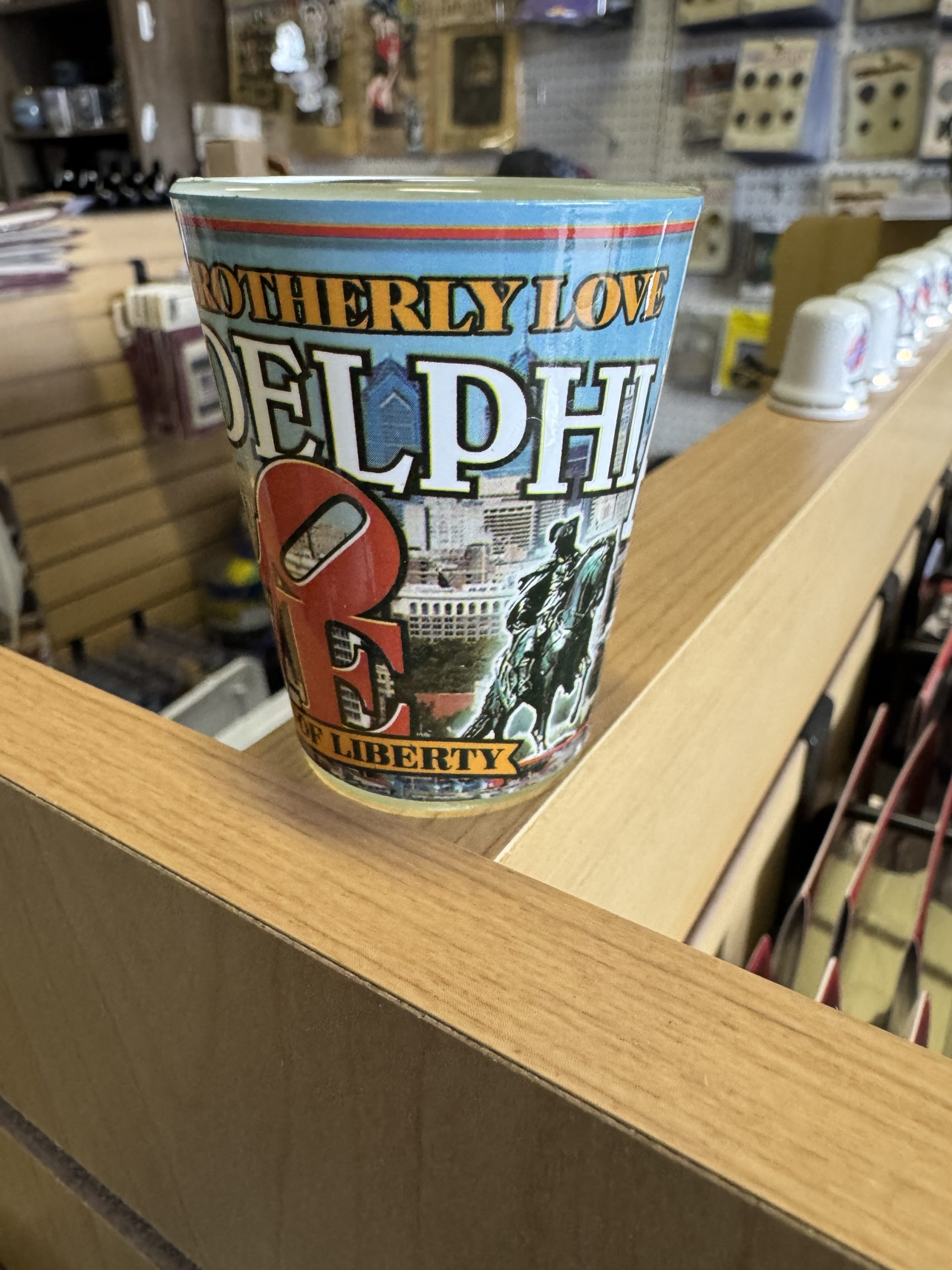 This shot glass captures a rugged elegance that feels steeped in heritage. The pressed glass features a bold “Philadelphia” and “City of Brotherly Love” inscription in raised, vintage-style lettering across the front, lending it a sense of handcrafted authenticity. Below, an etched banner frames the proud label “The Cradle of Liberty,” rooting the piece in American Revolutionary pride. Its thick, sturdy base and beveled edges give it a weighty presence—less of a souvenir, more of a tribute.