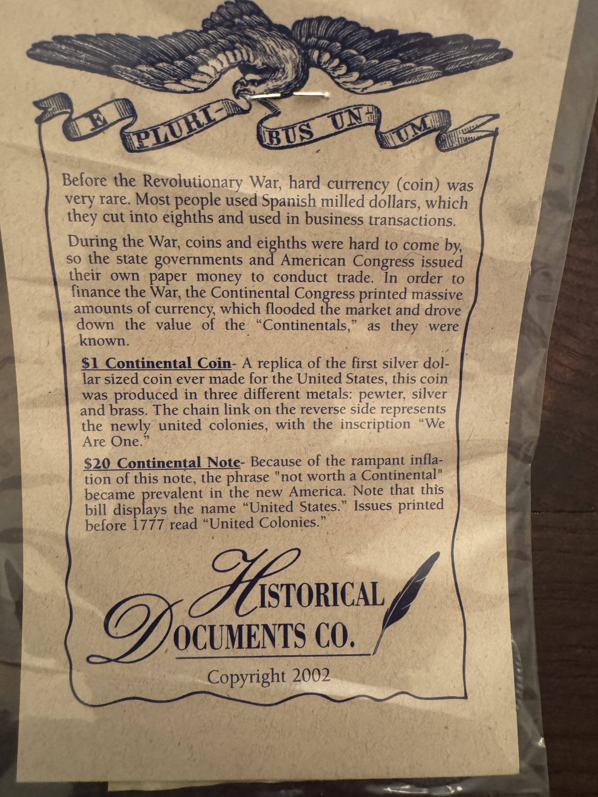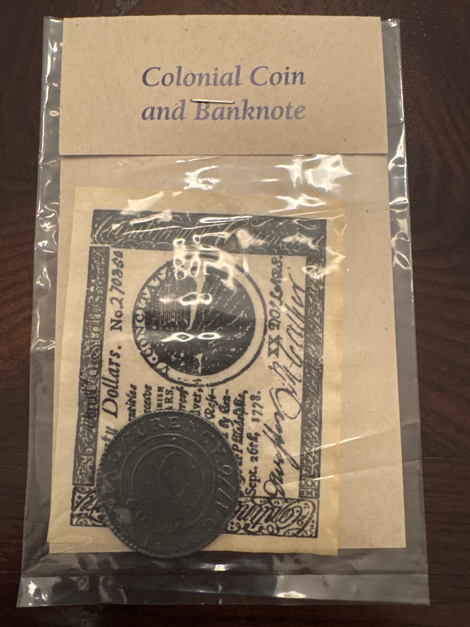 1776 Continental Dollar Coin and $20 Continental 1778 banknote. Includes the history of the items.