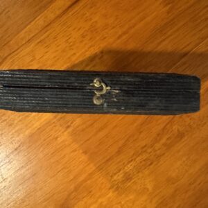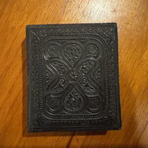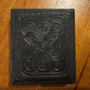 Encased in a velvet-lined, hinged case with embossed floral motifs, this mid-19th century photograph offers more than a likeness—it preserves a moment of dignity. The seated figure, dressed in somber attire, evokes the introspective spirit of an era shaped by faith and familial legacy. The ornate gold matting, paired with rich red velvet, signals the photograph’s emotional and material value—likely a daguerreotype or tintype, crafted to honor a loved one with permanence. This was not casual photography; it was ritualized remembrance.