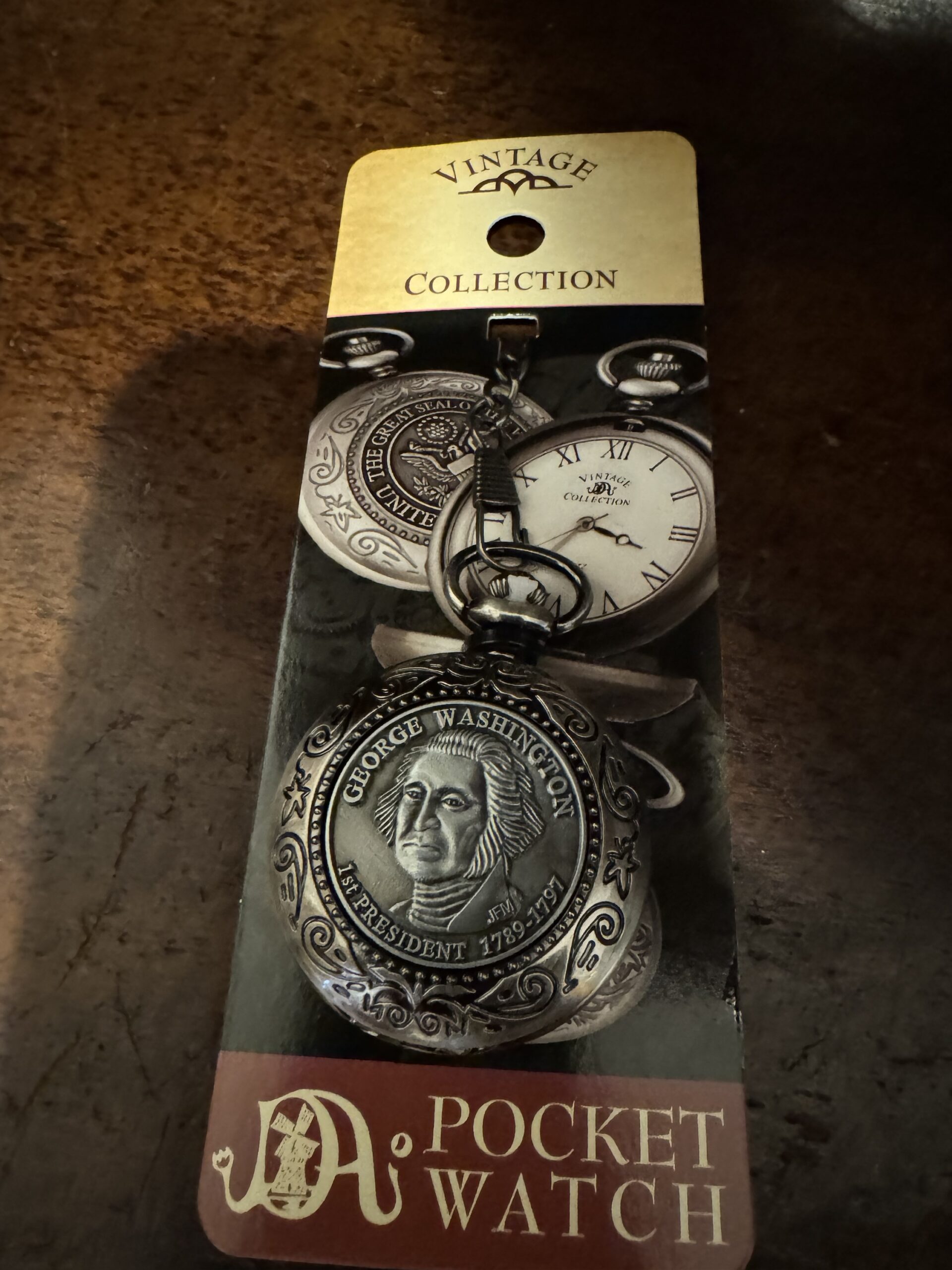 Pocket watch featuring a likeness of 1st President of the United States, George Washington with chain