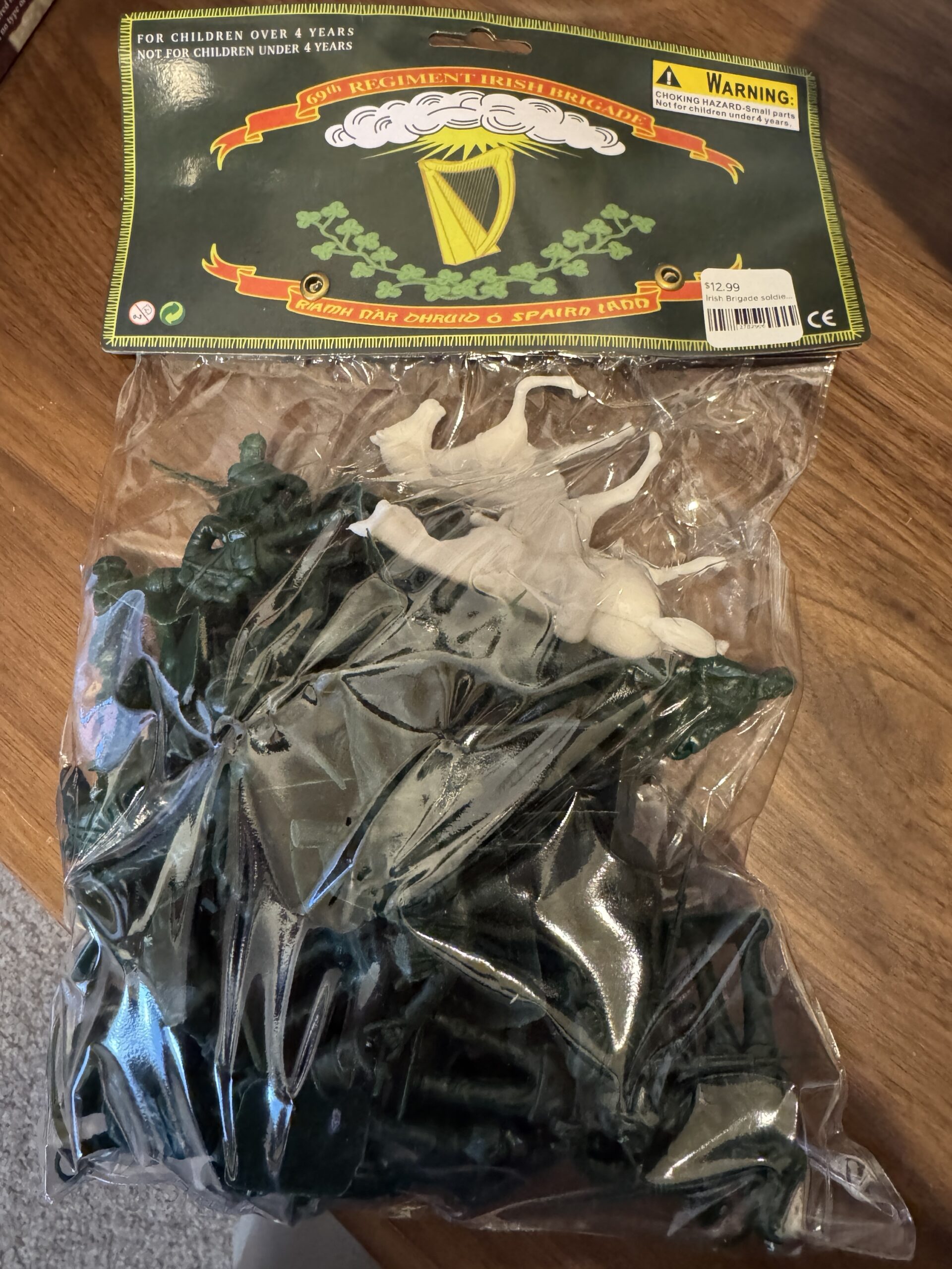 This plastic Irish Brigade soldier set captures the grit and determination of the men who marched under the Brigade’s banner—first‑ and second‑generation Irish Americans who fought to prove their loyalty to a nation that did not always welcome them. Each figure is cast with historically accurate detail. The varied poses—advancing, firing, rallying—allow you to stage a moment from the Brigade’s hard‑fought campaigns, from Antietam’s cornfield to the streets below Marye’s Heights. Durable enough for handling yet detailed enough for display, this set offers collectors, educators, and history enthusiasts a small but powerful window into the Irish Brigade’s legacy.
