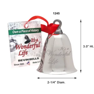 Bevin Bells made the actual bell in the iconic holiday classic, “It’s a Wonderful Life.” You remember the bell ringing on the tree as Clarence, the angel, gets his wings. Now you can own this keepsake remake of that bell. The bell has a memorable ring that will bring you right back to the movie. This 1245 Keepsake Bell is beautifully engraved with “It’s a Wonderful Life,” silver-plated and presented in a red velvet bag.