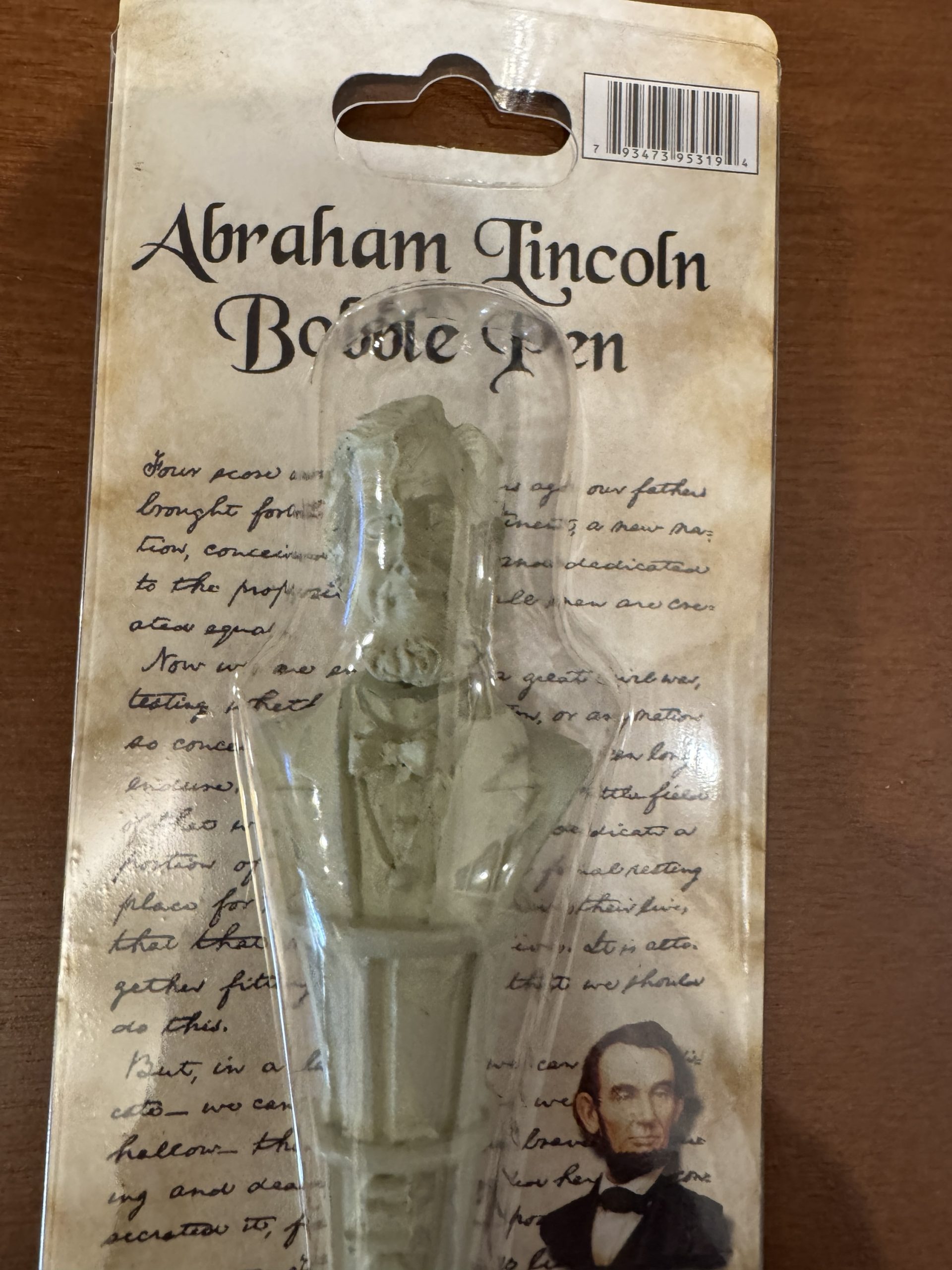 This 7″ long ivory white penny provides a small bobble head of Abraham Lincoln.