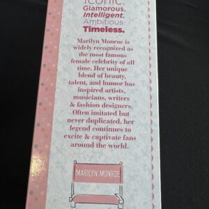 The packaging reinforces the iconography: a floral‑patterned backdrop, a portrait rendering of the figure, and a side panel listing five attributes — Iconic, Glamorous, Intelligent, Ambitious, Timeless — alongside a short biographical tribute to her enduring cultural impact. A stylized director’s chair labeled “Marilyn Monroe” anchors the design