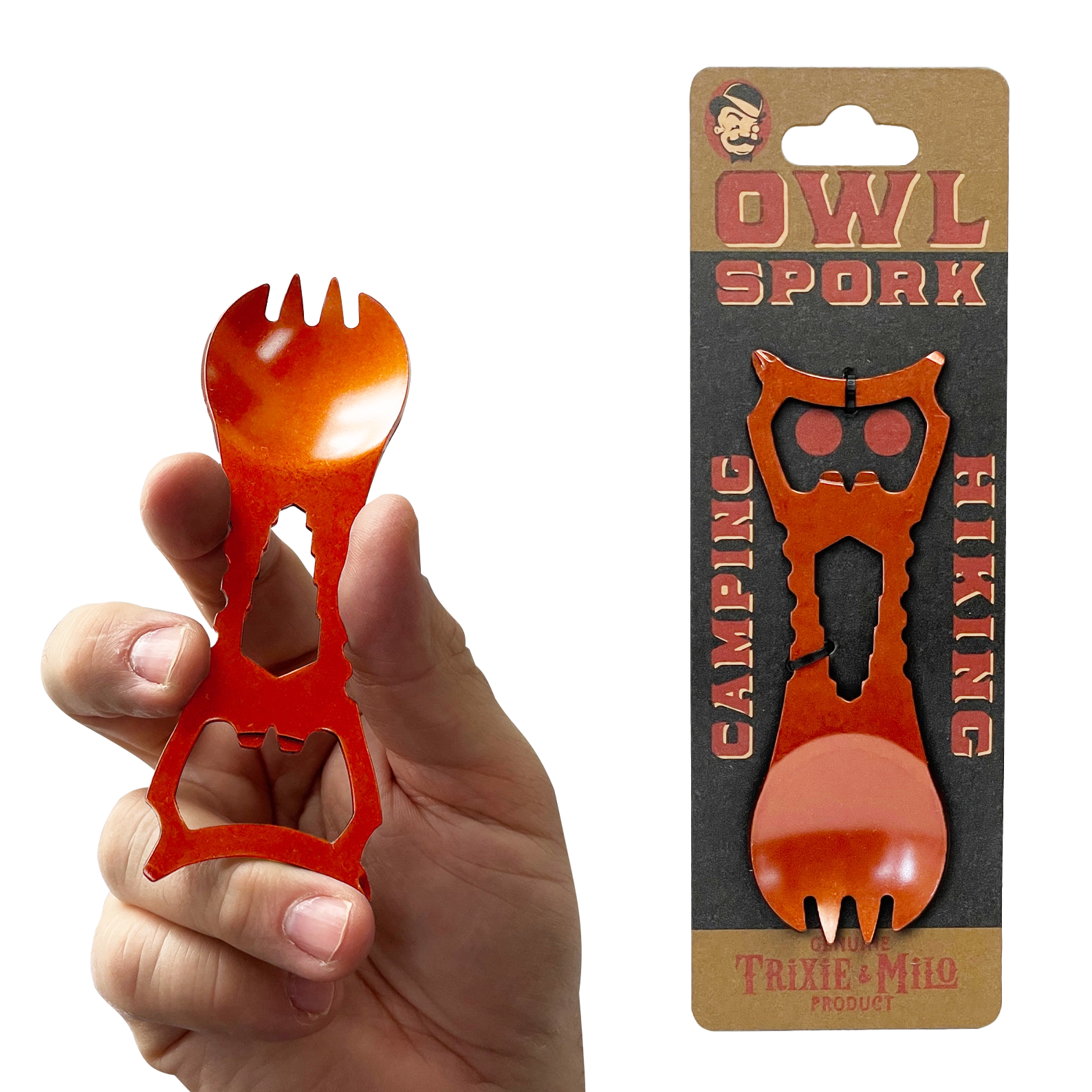 The Owl Spork is a camping and outdoor adventure must-have. With 10+ handy gadgets in one little Spork this exclusive Trixie & Milo design is a cut above the rest.