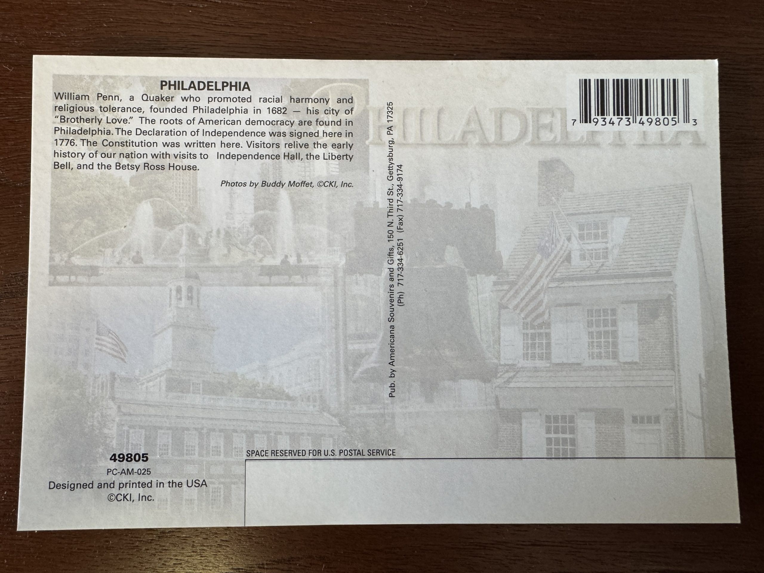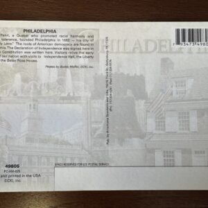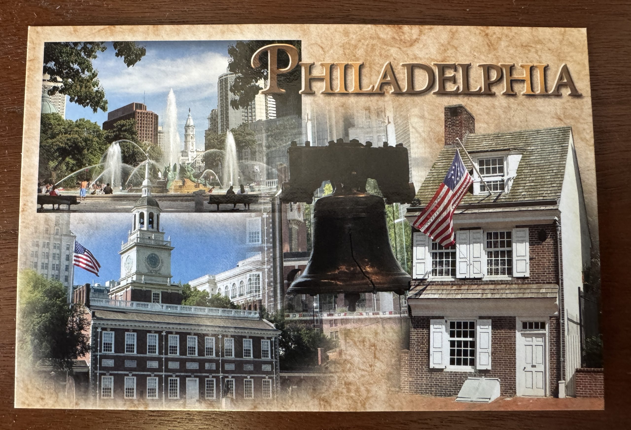 Landmarks post card featuring City Skyline, Betsy Ross House, Liberty Bell & Independence Hall