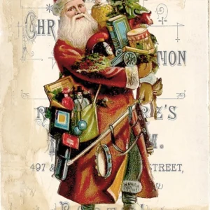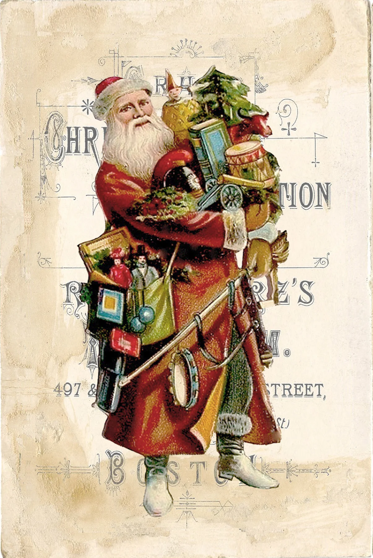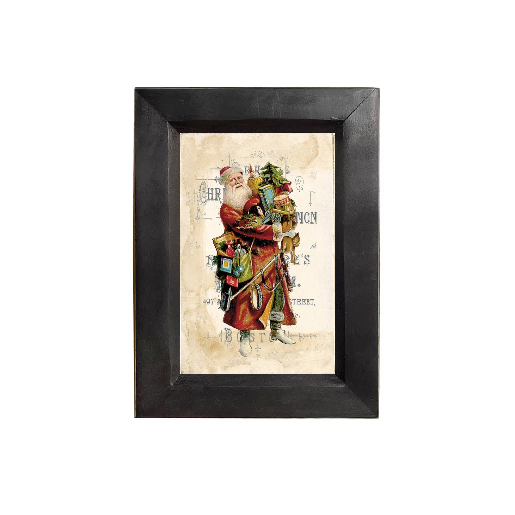 Victorian style color illustration of Santa Claus with his arms full of packages printed on satin photo paper and framed behind glass in your choice of frames. The back is finished with craft paper and a sawtooth hanger. A lovely addition to antique style Christmas decor!